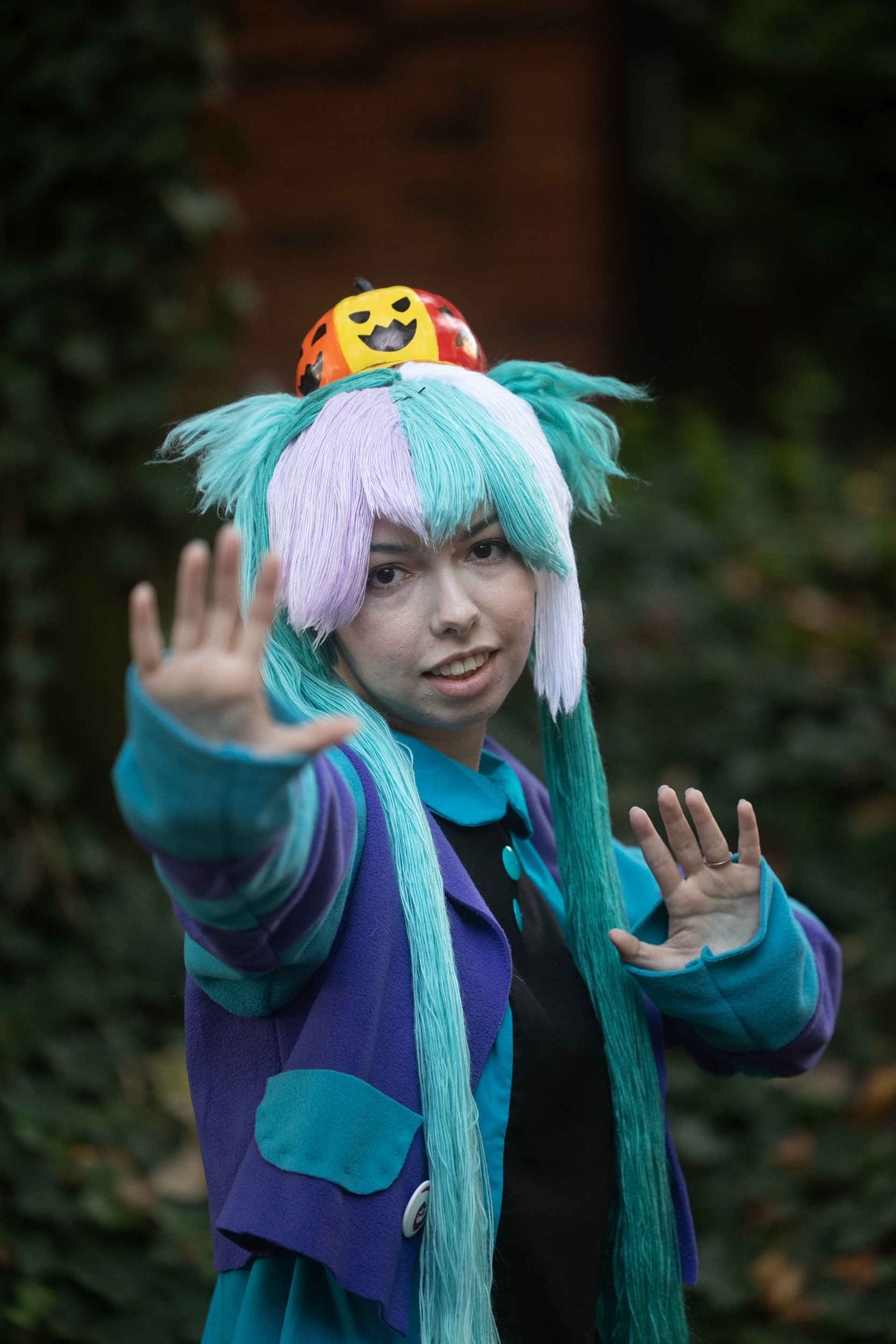 I constructed the blue & purple jacket and the purple & yellow jacket as well as all three yarn wigs. The yellow and teal socks were custom dyed.