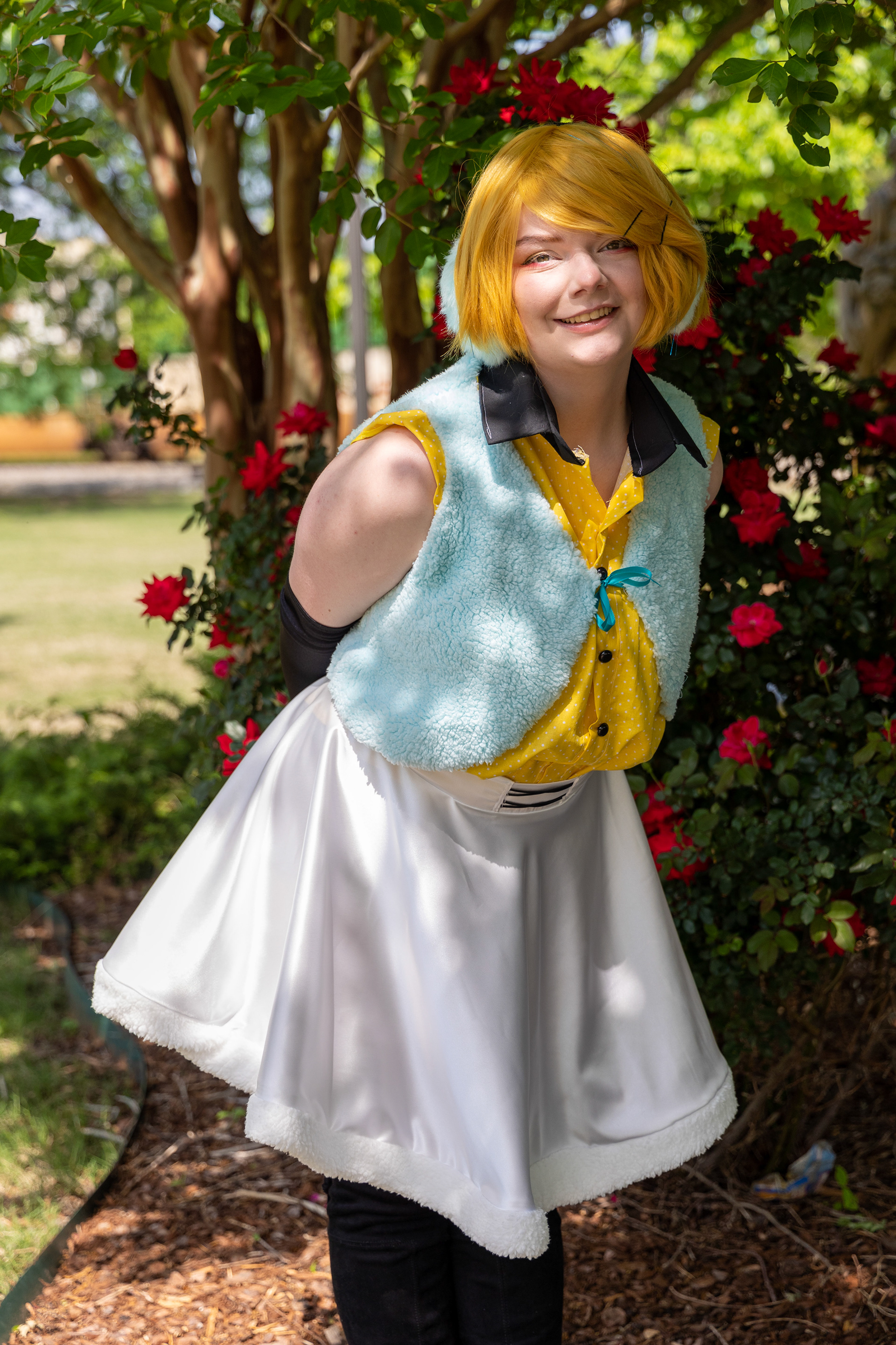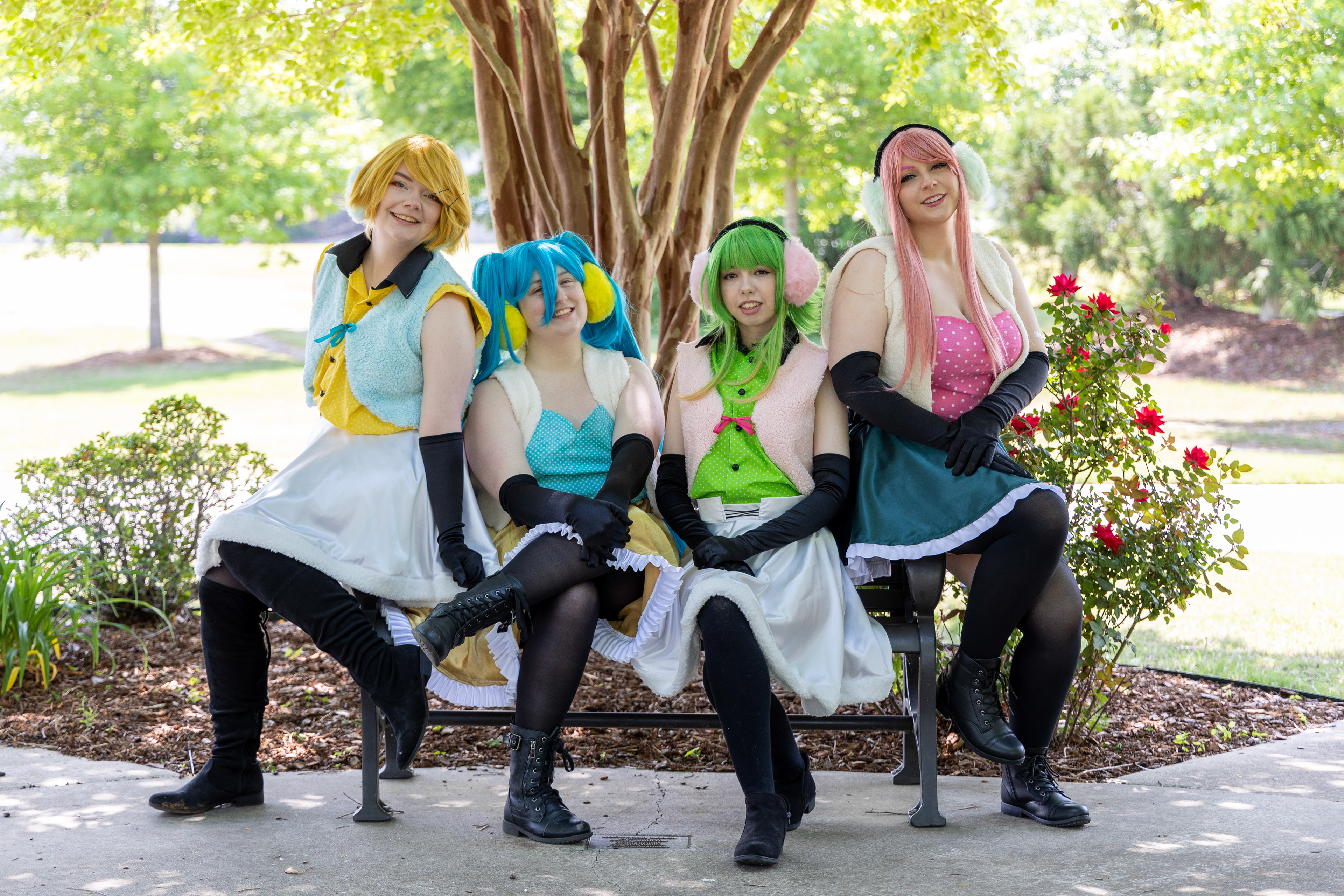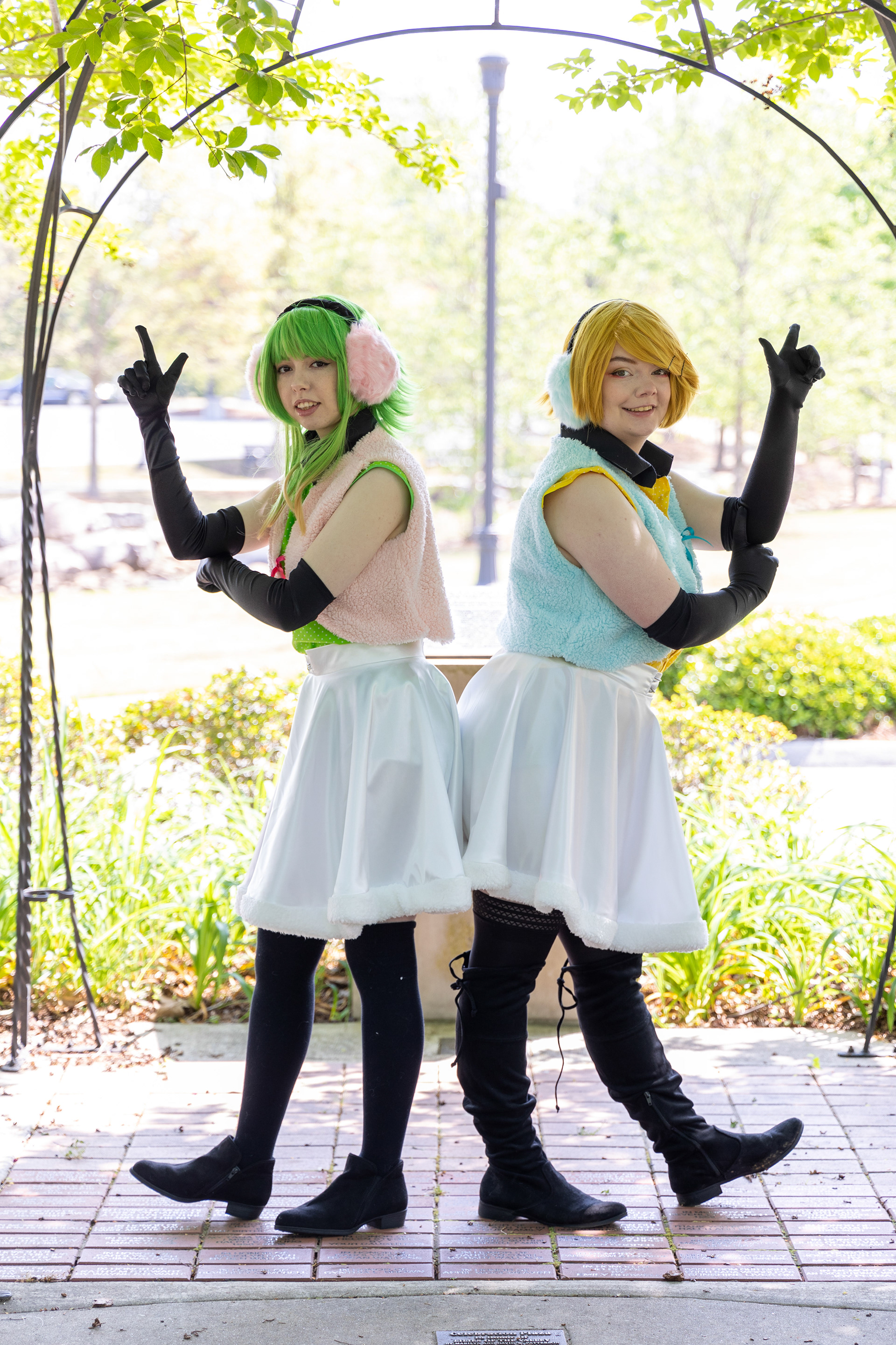 I constructed the outfits for both Rin (the yellow shirt) and Gumi (the green shirt). This includes the shirts, skirts, and fuzzy vests. The vests were custom dyed.