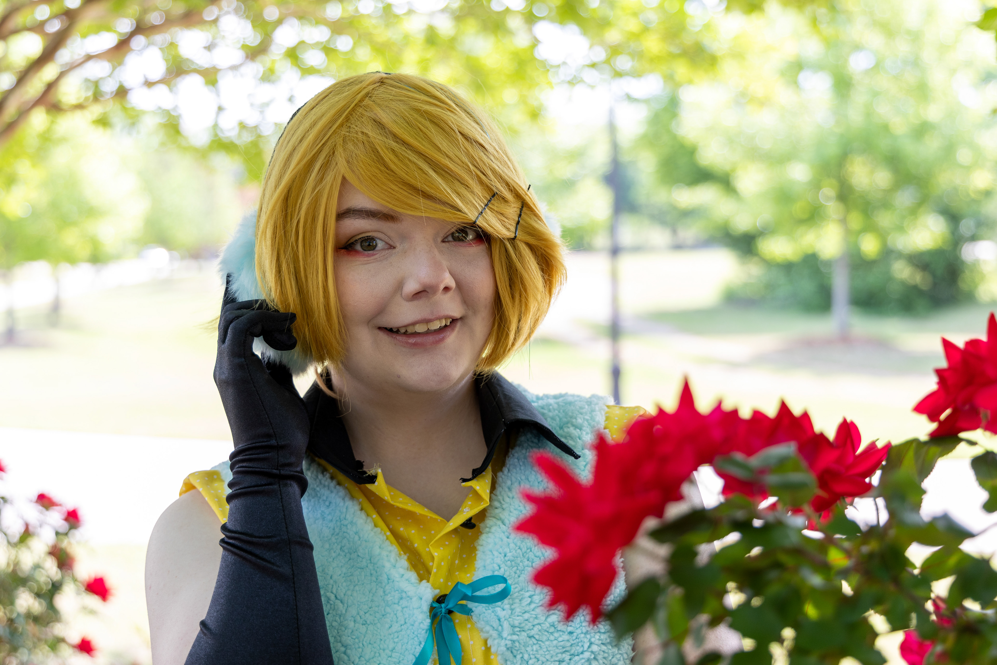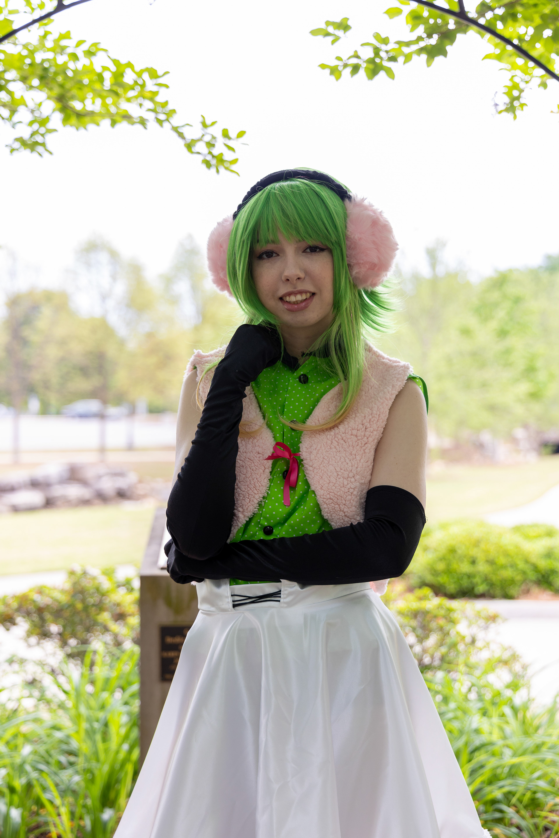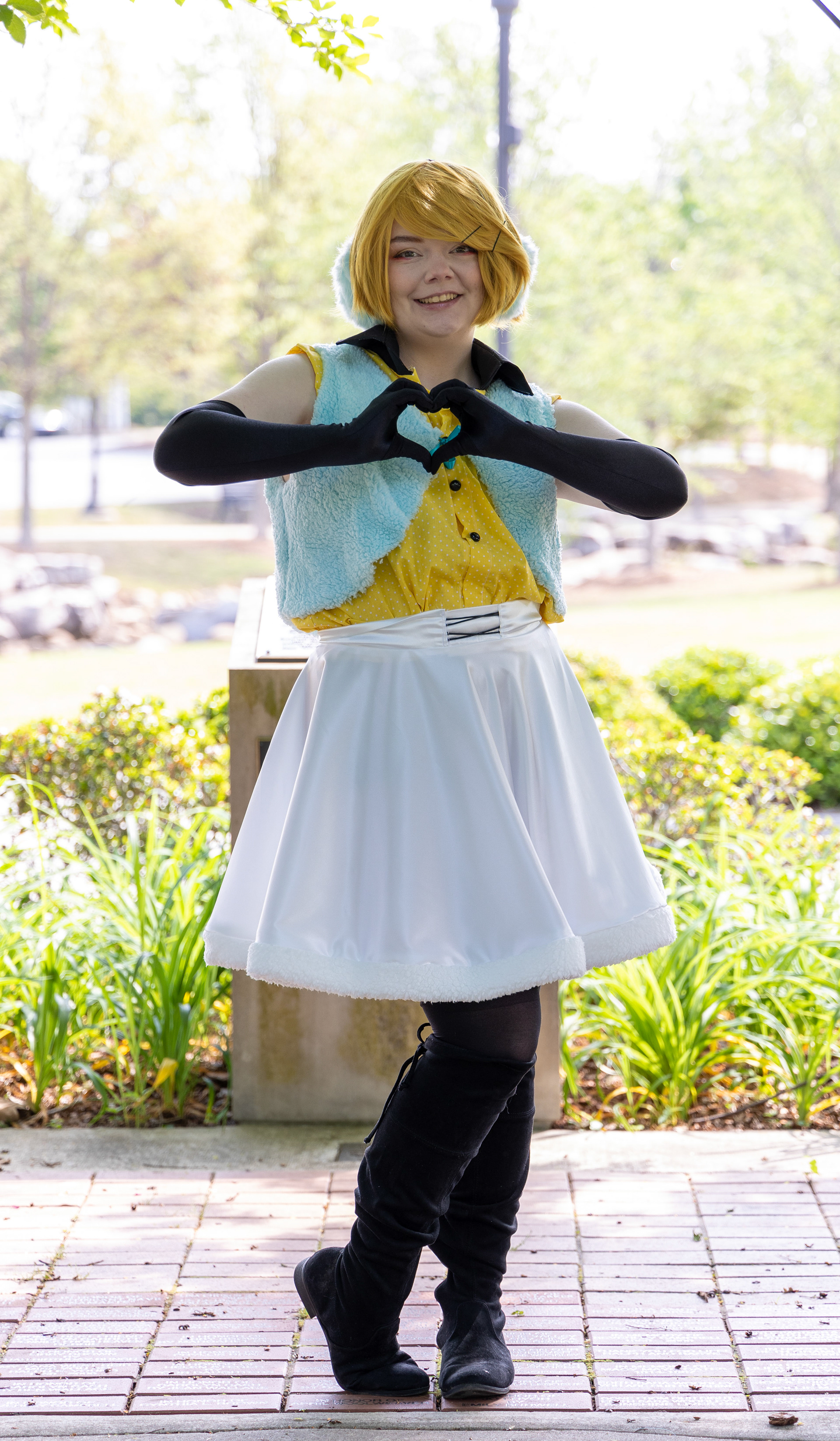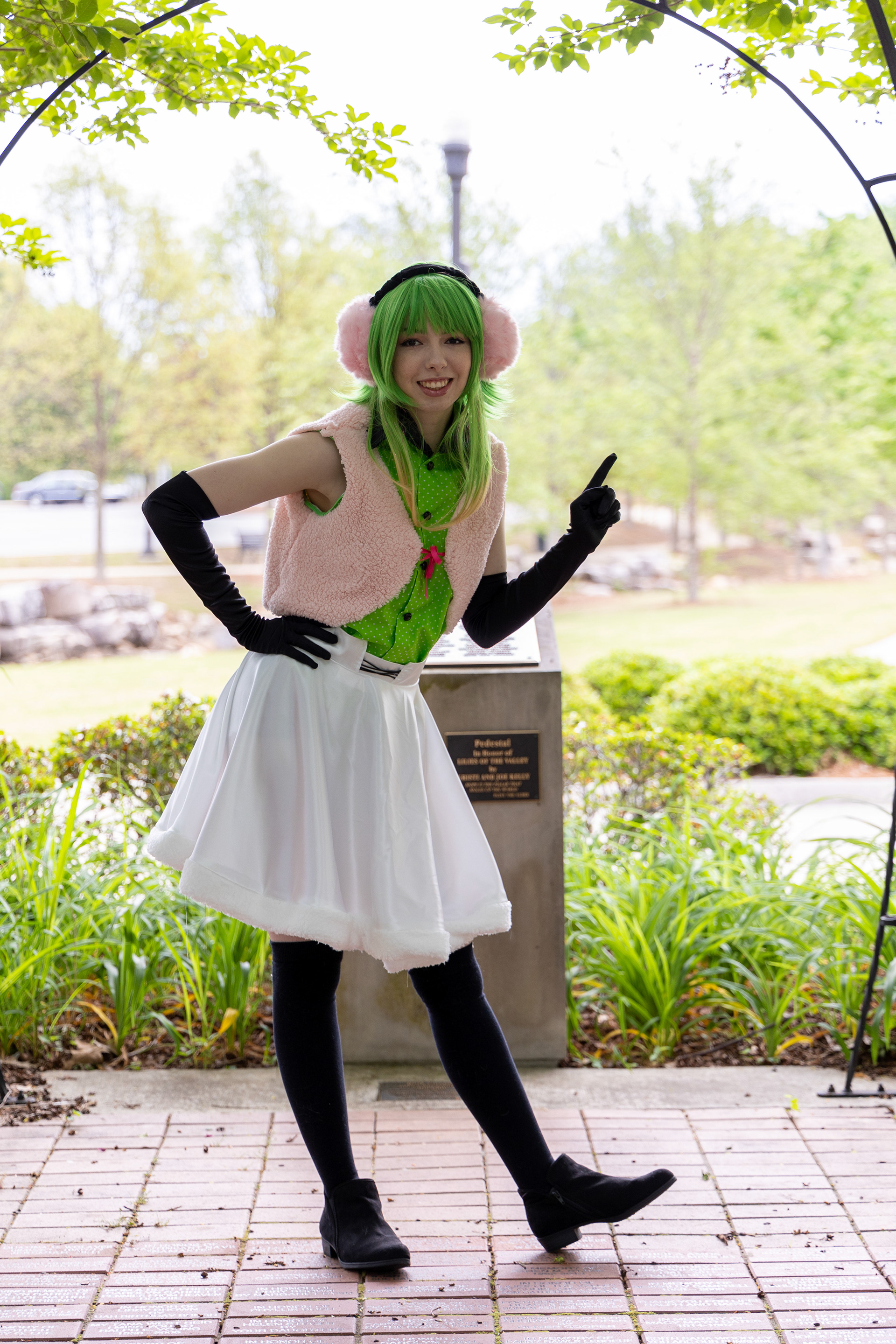 I constructed the outfits for both Rin (the yellow shirt) and Gumi (the green shirt). This includes the shirts, skirts, and fuzzy vests. The vests were custom dyed.